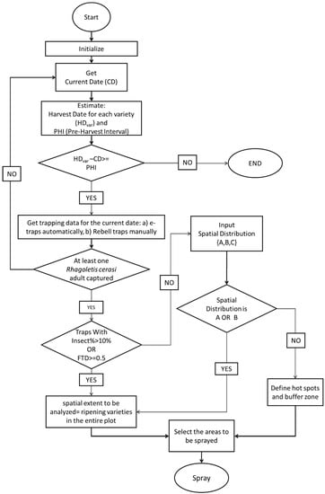 The Spatial Decision Support System (SDSS) that we developed is illustrated in Figure 2 and Figure 3 and a list of the terminology accompanied with their definition is provided in Table 2. The SDSS is composed of two algorithms that lead to a) the timing for the deployment of the trapping network in the field and b) decision(s) regarding timing of insecticide application against the European cherry fruit fly and the spatial location of application (“precision targeting”). The foundation of the first algorithm is a day degree model based on the lower developmental thresholds estimated by Baker and Miller [] and the biofix (diapause termination) estimated from data of Papanastasiou and co-workers []. The lower developmental threshold (LDT) for the cherry fruit fly has been estimated at 5 °C. The Day Degree buffer (DDb) has also been calculated at 32 °C. Based on the first algorithm (Figure 2), when DD on a given date reaches or exceeds the DDb, the trap network should be installed in the field. Timing of traps installation is quite important for the European cherry fruit fly, since the sticky traps used may accumulate debris of petals and sepals at the end of blossoming that diminish efficacy and dramatically increase trapping cost (labor for service, and replacement and use of new stick boards). The second algorithm is based on inputs regarding sweet cherry trees phenological stage, harvest dates and pre-harvest intervals for each cherry cultivar (calculated based on values from the last 3 years), estimation of the percentage of traps with captures (at least one R. cerasi adult), the parameter “flies per trap per day” and assessment of the spatial distribution of the fly’s captures within the experimental plot. The algorithm’s output defines the exact areas within each orchard where insecticidal application against R. cerasi should be applied, also taking into account the ripening stage of each cultivar.