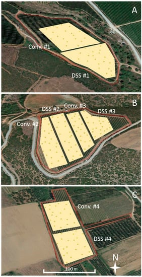 Digitization of coventionally treated (Conv.) and DSS treated plots in commercial cherry orchards. Yellow points indicate the position of Rebell traps. (A) Orchard #1, (B) Orchard #2, and (C) Orchard #3.