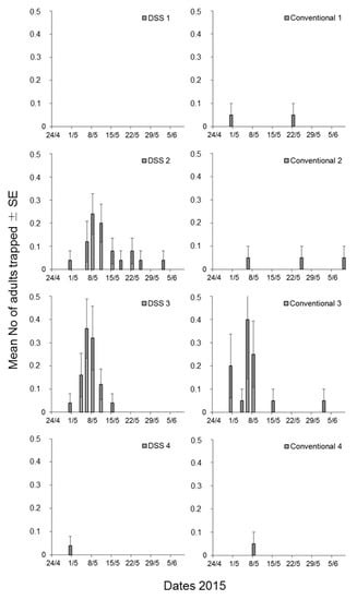 The population trends of R. cerasi in both the DSS and conventionally treated commercial orchards, and in the reference organic mixed farms during 2015 are shown in Table 4 and Figure 6 and Figure 7. Adult captures during 2015 were extremely low in all plots of the commercial orchards, not exceeding 0.4 flies/trap during the whole experimental period (Figure 6). Average adult captures were significantly higher in the reference organic orchards than the commercial orchards (Reference vs. DSS: Mann–Whitney U = 16.5, p < 0.001; Reference vs. Conventional: Mann–Whitney U = 14.5, p < 0.001). Rhagoletis cerasi captures were similar between Conventional and DSS treated plots (Mann–Whitney U = 151, p > 0.05). Adult flight period (evidenced by trap captures) was significantly longer in the reference orchards compared to commercial orchards (Reference vs. DSS: Mann–Whitney U = 54, p < 0.001; Reference vs. Conventional: Mann–Whitney U = 24, p < 0.001). The flight period was similar between DSS and Conventional plots (Mann–Whitney U = 2749.5, p = 0.044). Additional insecticide applications in the Conventional plots neighboring DSS plots, different pruning systems between commercial orchards and reference organic farms, as well as the inclusion of other fruit trees and intercropping methods in the latter may account for the longer flight period of R. cerasi and the higher percentage of traps with captures in the organic farms.
