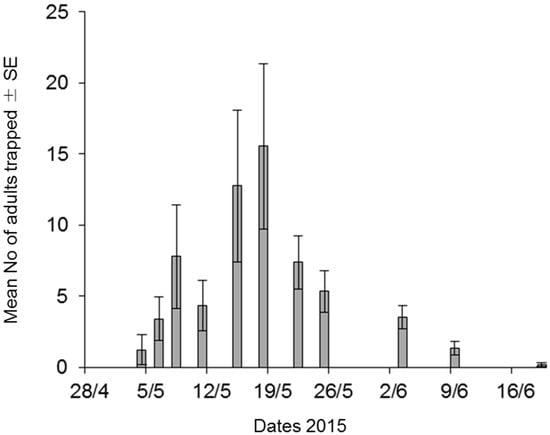 Phenological patterns of the European cherry fruit fly may be highly variable in different climatic conditions and, therefore, the developed algorithm should be locally adapted []. It is well documented that R. cerasi has developed a remarkable ability to adjust adult emergence in the wild in order to coincide with ripening periods of the host fruit []. Local adaptation and plastic responses of dormant pupae are key components to regulate adult emergence in the wild []. The short list of hosts, univoltinism and the relatively narrow periods of fruit ripening makes R. cerasi vulnerable to local extinction if timing of adult occurrence does not follow fruit ripening. Flight activity onset/end, duration and peak in the experimental area is typical for a lowland Greek R. cerasi population [].