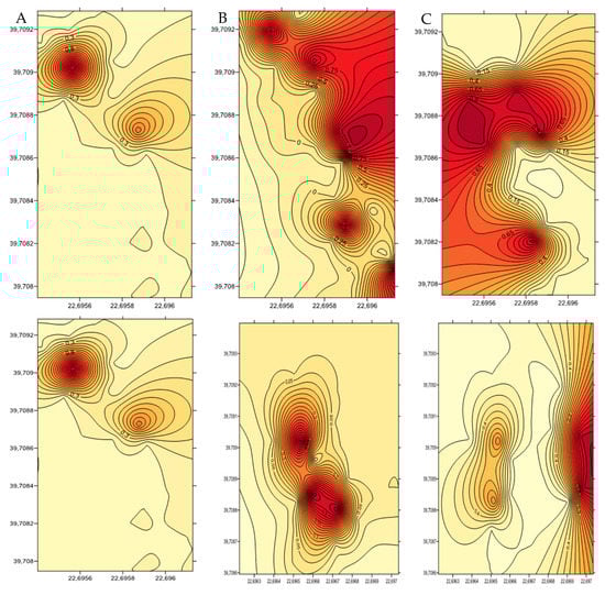 Spatial patterns of adult captures in DSS 2 (first row) and DSS 3 (second row) on 6 May 2015 (A), 8 May 2015 (B) and 11 May 2015 (C). The clumped distribution of captures at the beginning of the flight period was lost during the subsequent sampling dates in DSS 2. However, the number of captures was very low in DSS 3 and no solid conclusion could be extracted regarding the spatial distribution of captures. Intense red color indicates higher capture densities, while lines refer to the estimated density of adults. Captures in following days were very low.
