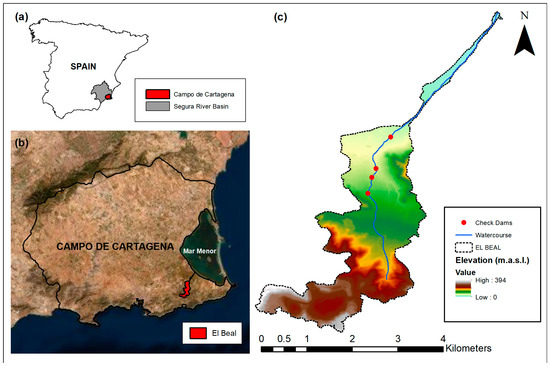 (a) Location map of Campo de Cartagena watershed as part of the Segura River Basin (Spain); (b) Situation map of El Beal within the Campo de Cartagena basin and Mar Menor coastal lagoon location; (c) Digital elevation model (DEM) and check dam location of El Beal watershed.