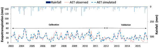 Although the SWAT model operates on a daily scale, the model calibration process was carried out at a monthly time-step, pursuant to the Split Sample Test hierarchical scheme proposed by Klemes (1986) [31]. The simulation period was split 70/30. AET data from 2003 to 2011 (a 9-year period) was selected for calibration of the model and from 2012 to 2015 (a 4-year period) for the validation process.
