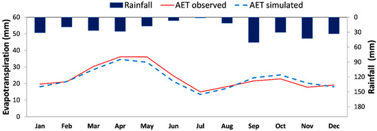 Comparison of average monthly simulated and observed AET for the calibration and validation periods.