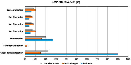 The assessment of BMPs was performed individually and in combination for the total period. The simulation results showed an effective reduction of sediment yield, total nitrogen (TN) and total phosphorus (TP) by application of individual BMPs (Figure 4) and a higher effectiveness when they were combined.