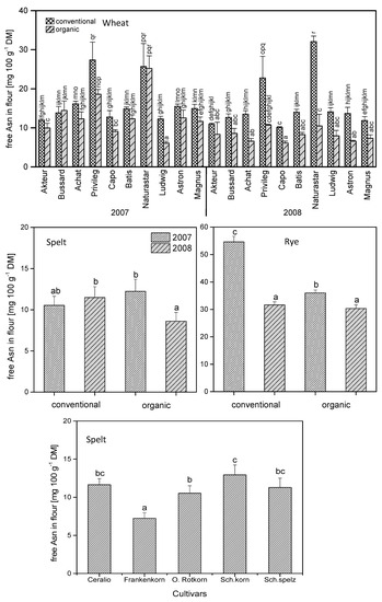 Free Asn content separated by species (wheat, spelt, rye), cropping system (organic, conventional), year (2007, 2008) and cultivars in dependence of their significant highest order interaction. Columns with different letters within cropping system and year indicate significant differences (α = 0.05, t-Test).
