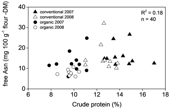 Between flours derived from the different wheat cultivars there was only a weak correlation of both parameters between different cultivars under both management practices in both years (R2 = 0.18, Figure 2), meaning that cultivars with high crude protein contents did not show high Asn levels per se and vice versa. The correlation of crude protein and Asn of winter spelt was weak across the two management systems and years (R2 = 0.1, data not shown) when averaged over cultivars, which was mainly due to a low variability of crude protein content between the management systems and years. Crude protein content and Asn content of rye correlated well with a R2 = 0.8 (data not shown).