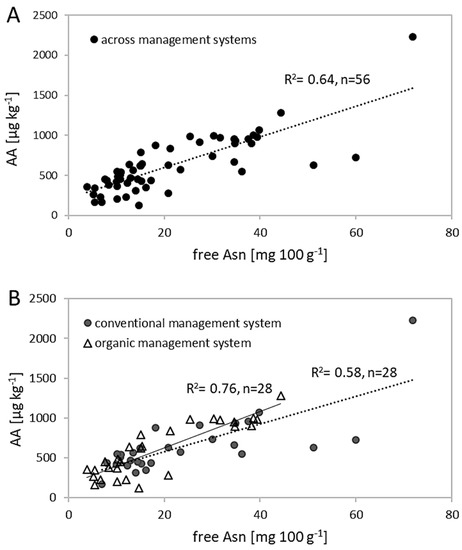 Free Asn and AA across management systems, years and species correlated well by R2 = 0.64 (Figure 3A). Separating the management systems led within both systems to a strong relation of both traits (Figure 3B). The conventional crop management system showed an R2 of 0.58, while for the organic management system the relation was even stronger with R2 = 0.75. For wheat, both traits correlated with R2 = 0.82 in 2007 and R2 = 0.5 in 2008 for the conventionally produced samples and with R2 = 0.76 in 2007 and R2 = 0.86 in 2008 for the organically produced wheat flours.