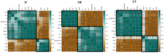 A correlation matrix for physiological traits, yield components and grain stable isotope composition (2017 year of study). Treatments; IC: inoculated control, CB: coated with PsJN strain, CT: coated with thyme oil. Traits; 13 C: δ13Cgrain, 15N: δ15Ngrain, C: Cgrain, N: Ngrain, GY: Grain yield, SY: Straw yield, TKW: Thousand kernel weight, CT: Canopy temperature, SLB: SLB severity. The darker, bigger blue squares indicate a stronger positive correlation. The darker, bigger brown squares indicate stronger negative correlation.