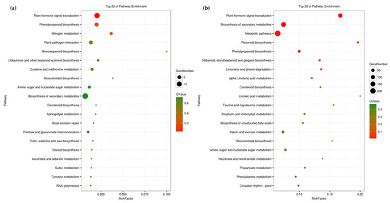 Given the difference in the number of DEGs in response to the two P. brassicae pathotypes at 4 dpi, we examined KEGG pathway enrichment at this time point. The top 20 enriched pathways are shown in Supplementary Table S4. A comparison between LAB-4 and control samples revealed that the DEGs were enriched in “plant hormone signal transduction” (ko04075), “phenylpropanoid biosynthesis” (ko00940), “nitrogen metabolism” (ko00910), and “plant–pathogen interaction” (ko04626) pathways (p < 0.05) (Supplementary Tables S5, S6, and Figure 4a). Notably, the “plant–pathogen interaction” pathway was not identified as an enriched pathway in the comparison between SCCD-52 and LAB-4 samples at the same time point (Figure 4c), suggesting that the CR gene is an early marker for P. brassicae infection. Given that changes in DEG profiles as a function of post-inoculation time differed for the two P. brassicae pathotypes, we also performed KEGG pathway enrichment analysis at 8 dpi. The top 20 enriched pathways are shown in Supplementary Tables S7 and S8. “Plant hormone signal transduction” was significantly enriched (with the highest RichFactor) in the comparison between LAB-4 and control samples, and the number of DEGs was higher at this time point than at 4 dpi (Figure 4b). Thus, plant hormone signaling likely plays an important and sustained role in the resistance to avirulent P. brassicae. The number of DEGs in the “plant–pathogen interaction” pathway was also increased; however, this pathway was not enriched in SCCD-52-infected plants at 8 dpi. Additionally, “plant hormone signal transduction” was enriched in the comparison between avirulent LAB-4 and virulent SCCD-52 (Figure 4d). Thus, plant hormone signaling mediates the resistance of Chinese cabbage to clubroot.