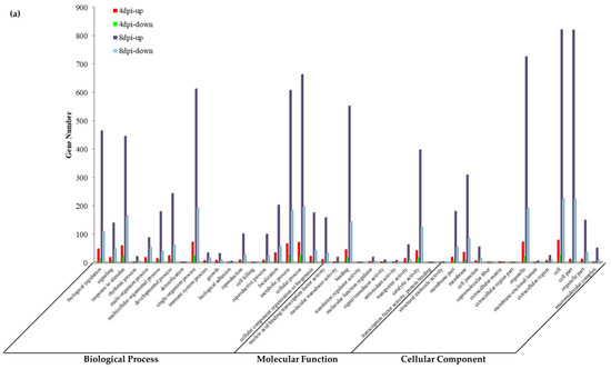 GO categories of DEGs in LAB-4 and SCCD-52. Unigenes were mapped to three main categories: biological process, molecular function, and cellular component. (a) LAB-4 vs. control; (b) LAB-4 vs. SCCD-52. The y-axis shows the number of annotated DEGs.