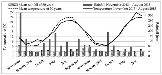 A two-year field experiment was carried out in 2014–2015 at the MOVE-LTE (MOnsampolo VEgetables Long-Term organic Experiment) in central Italy (42°53′ N, 13°48′ E). The site is characterized by a “thermo-Mediterranean” climate [29], with an average total annual precipitation of 564 mm and temperatures averaging 9 °C and 20 °C in the October–March and April–September growing periods, respectively. Mean monthly temperatures and rainfall during the studied period (October 2013–August 2015), compared with the long-term average values (30 years), are shown in Figure 1.