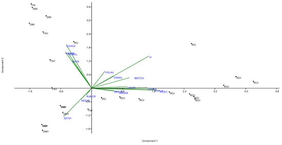 The PCA extracted two components accounting for 32.9% of the total variability in the sample dataset (the first axis explained 18.0% of the total matrix variance). Ordination of the studied weed species along Components 1 and 2 is shown in Figure 2.