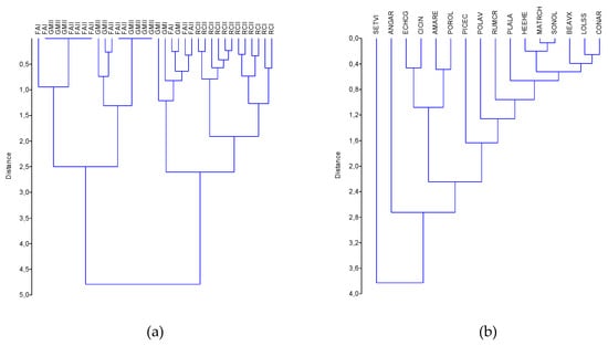 Results of hierarchical clustering (Figure 3a) contributed to discriminate RC treatments from tilled ones. RC samples were grouped together, and were rather clearly segregated from the major cluster mixing No_ASC and GM. A second clustering run on species frequency (Figure 3b) confirmed basic PCA results, grouping the species PICEC, POLAV, Rumex crispus L. (RUMCR), PLALA, Hedera elix L. (HEEHE), and MATCH. At the same time, this dendogram confirmed the distinctive spatial distribution of SETVI with respect to the other species. Moreover, a similar spatial distribution was observed for AMARE, POROL, CHICIN, and ECHCG.