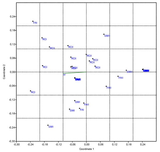 The NMDS analysis discriminated RC treatments in respect with the other variables (Figure 4). Line vectors running from the centroid of the NMDS ordination plot to each individual treatment illustrate pair-wise correlations between Shannon H’ diversity and each of the plant samples in the treatments. The line vector highlights a latent shift of H’ toward RC, indicating that species diversity increases in samples with the greatest association with RC, particularly RC I. The No_ASC and GM treatments were less clearly separated from the rest of the sample.