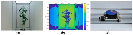 Images captured in the imaging chamber. (a) color image of a plant, (b) depth image of a plant, (c) precision turntable.