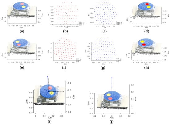 Calibration of the Kinect sensor position. (a) Segmentation of the point cloud of the turntable (0°); (b) Point cloud of the red calibration label (0°); (c) Point cloud of the yellow calibration label (0°); (d) Identification of the calibration labels (0°); (e) Segmentation of the point cloud of the turntable (180°); (f) Point cloud of the red calibration label (180°); (g) Point cloud of the yellow calibration label (180°); (h) Identification of the calibration labels (180°); (i) Normal vector of the axis of rotation of the turntable (original coordinates); (j) Normal vector of the axis of rotation of the turntable (after transformation).