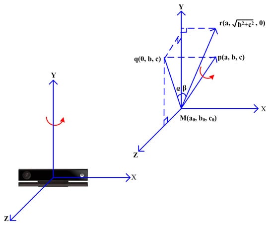 Figure 3 shows the coordinate system of the Kinect sensor. Multiview point cloud coordinate systems are unified according to the following steps. Step 1: The point cloud at each AOV, pointCloudi, is first translated by M(a0, b0, c0), and the central point of the axis of rotation is translated to the origin (0, 0, 0) of the coordinate system of the Kinect sensor, as shown in Equation (1). Step 2: pointCloudi is rotated, and the normal vector of the axis of rotation is rotated to the Y-axis. Specifically, the normal vector P(a, b, c) of the axis of rotation is first rotated around the X-axis by −α° to the XOY plane and then rotated around the Z-axis by β° to the Y-axis, that is, the following operation is performed: P × Rx(−α) × Rz(β), as shown in Figure 3. Rx(−α) and Rz(β) are then calculated using Equations (2) and (3), respectively. Then, based on the actual angle of the turntable at each AOV, the angle γ° by which the axis of rotation is counterrotated is determined, and the counterrotation matrix Ry(γ) is then determined as shown in Equation (4). The following rotation operation is performed on pointCloudi: pointCloudi × Rx(−α) × Rz(β) × Ry(γ). The point cloud at the initial AOV, pointCloud1, is the reference point cloud, which will not be counterrotated around the Y-axis. Figure 2i shows the coordinates of the initial point cloud of the turntable. Figure 2j shows the result obtained by moving the central point of the optical axis of the turntable to the origin of the coordinate system of the Kinect sensor and the normal vector of the axis of rotation of the turntable to the Y-axis.