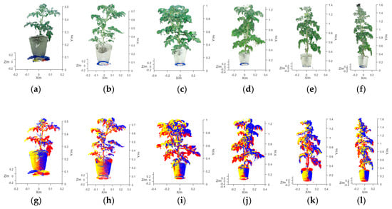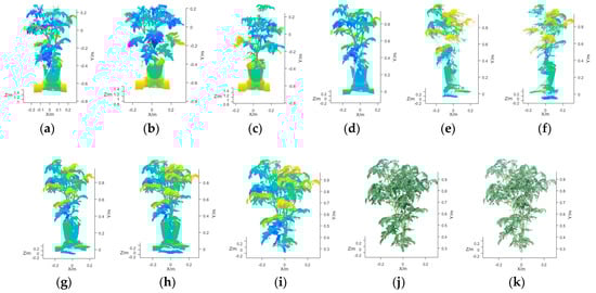3D point cloud reconstructions of greenhouse tomato plants (GTPs): (a) 0° point cloud; (b) 120° point cloud; (c) 240° point cloud; (d) 0° point cloud transformation; (e) 120° point cloud transformation; (f) 240° point cloud transformation; (g) iterative closest point (ICP) (0°, 120°); (h) ICP (0°, 120°, 240°); (i) canopy area (depth map); (j) canopy area (RGB); (k) point cloud down-sampling.