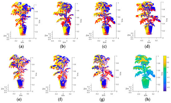 Results of the 3D point cloud reconstruction of a plant with different reconstruction methods: (a) V3-1; (b) V3-2; (c) V3-3; (d) V3-4; (e) V4-1; (f) V4-2; (g) V4-3; (h) depth map.