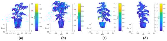 Based on the above analysis, for measurements taken at V3, V4, and V6, the average Crs were 85.45%, 90.17%, and 93.62%, respectively. The greater the number of perspectives, the greater the coverage, but the lower the reconstruction efficiency. Because the SSB is an entity measurement object, and the tomato plant is only partially blocked under each perspective, V3 and V4 reconstruction methods were selected to reconstruct the greenhouse tomato plants.