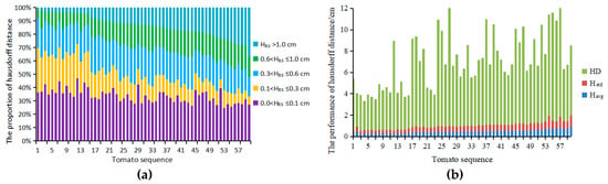 To quantitatively describe the accuracy of SSB 3D point cloud reconstruction, the distribution of the HRS set of each of the SSBs with diameters of 30, 40, 50, and 60 cm and the corresponding point clouds reconstructed based on images captured by the Kinect sensor in three positions (P1, P2, and P3) and at three, four, and six AOVs (V3, V4, and V6) (a total of 36 combinations of measurement conditions) were statistically analyzed. The results are shown in Figure A3a. HRSs were categorized into five groups for statistical analysis, namely, 0 cm < HRS ≤ 0.2 cm, 0.2 cm < HRS ≤ 0.5 cm, 0.5 cm < HRS ≤ 0.8 cm, 0.8 cm < HRS ≤ 1.2 cm, and HRS > 1.2 cm.