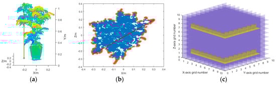 The 3D shape of a tomato canopy is complex. The method of the outer envelope convex volume cannot accurately describe the canopy volume. The large spaces in the convex volume will affect the accuracy of the volume measurement. This study established a method for the calculation of the canopy volume of a tomato plant, with the circumscribed cuboid of the tomato canopy divided into several cube voxels [42,43]. According to the voxel precision, the number of lattices of the X, Y, and Z axes of the cuboid could be determined. The 10 × 10 × 10 voxel division diagram is illustrated in Figure 8c. First, the displacement operation of the canopy point cloud coordinates was performed. The minimum coordinates Xmin, Ymin, and Zmin were respectively subtracted from the X, Y, and Z triaxial coordinates. Based on Equations (13)–(15), the cuboid was divided into voxels, and the 3D array of the voxels was initialized, with the initial value of each voxel being 0. According to Equation (16), the voxels of the point cloud were searched, and the voxel containing the point cloud was labeled as 1. The number of voxels containing the point cloud was counted, and the canopy volume was obtained based on the voxel precision.