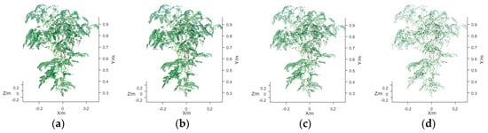 The point cloud down-sampling method (3D box filter threshold) and the voxel precision of the 3D point cloud model directly affect the accuracy of the tomato canopy volume. In this study, the point cloud model was down-sampled using 3D box filters of 2, 3.3, 5, and 8 mm, as shown in Figure 9a–d. At the same time, the point cloud model was connected to the outer cuboid for meshing, and 3D voxel models with voxel accuracies of 2 × 2 × 2 mm3, 3.3 × 3.3 × 3.3 mm3, 5 × 5 × 5 mm3, and 8 × 8 × 8 mm3 were established. The voxels of the point cloud were searched, and the voxels containing point clouds were labeled. As shown in Figure 9e–h, the number of voxels containing point clouds was counted, and the canopy volume was obtained based on the voxel precision.