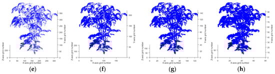 Calculation of the canopy volume of a greenhouse tomato plant: (a) Box filter: 2 mm; (b) Box filter: 3.3 mm; (c) Box filter: 5 mm; (d) Box filter: 8 mm; (e) Voxel: 2 × 2 × 2 mm3; (f) Voxel: 3.3 × 3.3 × 3.3 mm3; (g) Voxel: 5 × 5 × 5 mm3; (h) Voxel: 8 × 8 × 8 mm3.
