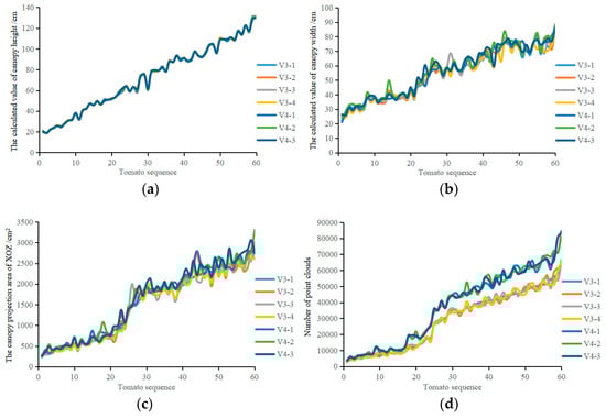 In this study, the canopy volume V of the tomato plants was calculated using the V3 and V4 measurement modes with voxel precisions of 2, 3.3, 5, and 8 mm, as shown in Table 3.