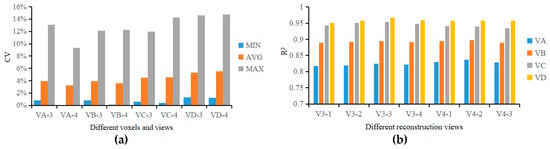 As shown in Figure 11a, the MIN of the CV was 0.00% in the VB-4 mode, and the MAX of the CV was 14.76% in the VD-4 mode. The statistical results of tomato canopy volume variability showed that the range of the mean CV was 3.25%–5.53% by different calculation methods, and the correlation of the coefficient of variation was not significant. However, with the increase in the voxel precision, the maximum coefficient of variation showed a significant increasing trend.