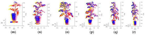 To verify the applicability of the multiview RGB-D reconstruction method and the morphological feature parameter calculation method proposed in this study, the 3D point cloud reconstruction was performed on 60 GTPs, obtaining the RGB point cloud maps of the tomato plants shown in Figure 12a–f. The point cloud maps of the tomato plants reconstructed based on three views are shown in Figure 12g–l, and the point cloud maps of the tomato plants reconstructed based on four views are shown in Figure 12m–r. Additionally, the R2, RMSE, and RAD of the calculated values of H, W, V, and FW were statistically analyzed with the values of the actual manual measurements.