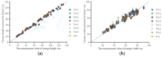 The correlation between the actual measurement values of the plant canopy H and W and the Kinect measurement values is shown in Figure 13a,b. The Kinect measurements of the plant canopy H and W could be calculated directly from the reconstructed point cloud, as shown in Equations (10) and (11).
