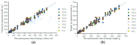 As shown in Figure 14a,b, in the V3 measurement mode, the R2, RMSE, and RAD between the calculated values of the plant canopy V by the regression model and the manual measurement values were 0.9297, 23.95 cm3, and 9.77%, respectively. The R2, RMSE, and RAD between the calculated values of the plant canopy FW by the regression model and the manual measurement values were 0.9056, 20.24 g, and 10.62%, respectively. In the V4 measurement mode, the R2, RMSE, and RAD between the calculated values of the plant canopy V by the regression model and the manual measurement values were 0.9205, 23.46 cm3, and 9.27%, respectively. The R2, RMSE, and RAD between the calculated values of the plant canopy FW by the regression model and the manual measurement values were 0.9108, 15.99 g, and 8.52%, respectively.