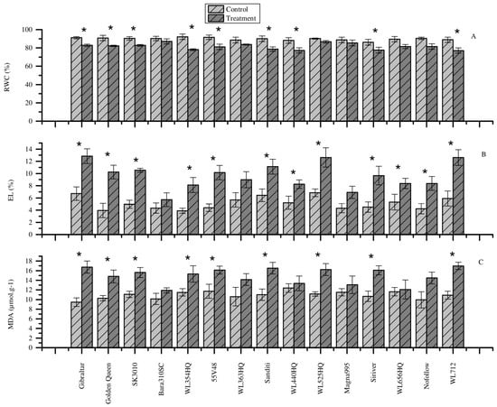 Effects of heat stress on physiological parameters. (A) Relative water content. (B) Electrolyte leakage. (C) MDA content. Each bar represents the mean (n = 5) and the error bar indicates the standard deviation. Asterisks indicate statistically significant differences between control and treatment group for each cultivar (p < 0.05), independent sample t-test. EL is electrolyte leakage, MDA is malondialdehyde.