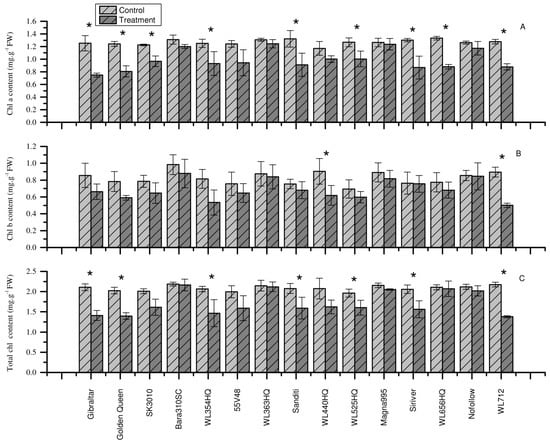 Effect of heat stress on the chlorophyll content of alfalfa cultivars. (A) Chlorophyll a content. (B) Chlorophyll b content. (C) Total chlorophyll content. Each bar represents the mean (n = 5) and the error bar indicates the standard deviation. Asterisks indicate statistical significant differences between control and treatment group for each cultivar (p < 0.05), independent sample t-test.