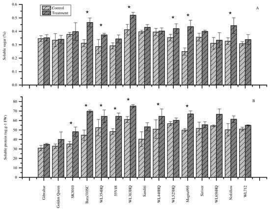 The soluble sugar content of all alfalfa cultivars showed an increment under heat stress relative to the control (Figure 3A). Heat stress significantly increased the soluble sugar content of Bara310SC, Magna995, WL363HQ, Nofollow, WL525HQ, and WL354HQ by 20.20%, 15.57%, 11.53%, 7.13%, 4.68%, and 2.22%, respectively (Figure 3A). The results showed that these cultivars produce higher soluble sugar to maintain their osmotic potential and organize proteins and cellular structures under heat stress, which increases heat tolerance.