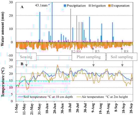 Weather condition during the experimental period. (A) Precipitation, evaporation, and irrigation and (B) air and soil temperature. R2 indicates reproductive stage 2 of soybean growth.