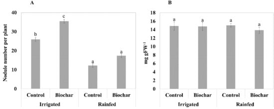 Biochar increased the nodule number by 9.0 per plant under the irrigated conditions (Figure 3A) while no significant increase was detected under the rainfed condition. The Lb content was unchanged after the biochar application in both the irrigated and rainfed condition (Figure 3B).