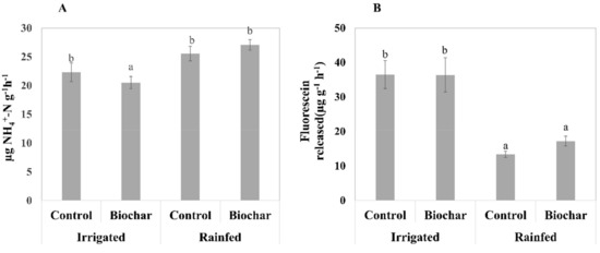 Soil protease activity decreased in biochar-amended soil under the irrigated condition. Geisseler and Horwath observed that the high uptake rate of the additional N by plant resulted in the decreased need for N from the hydrolysis of N compounds []. They suggested that the protease activity depends on the N demand of plants. The N supplied by BNF may also reduce the N need from the soil N mineralization for plants use. Consequently, protease synthesis may be inhibited. Additional evidence in the RDA triplot showed that biochar has an enhancing effect on the negative relationships between protease activity and plant shoot dry weight/shoot N concentration. The reverse direction between the vector of protease activity and plant shoot dry weight/shoot N in the RDA indicated a negative correlation, whereas the angle closing to 180° between the vector of protease activity and plant shoot dry weight/shoot N in biochar treatments indicated a strong relation. Additionally, as discussed in the prior section, the plants which were grown in the soil without the biochar application were supposed to take more N from the soil than those grown in biochar-added soil. Therefore, in the control soil, the N that is taken up from the soil mostly originated from N mineralization and inherent soil mineral N since no N fertilization was performed during the cropping period. This may explain why the protease activity was significantly higher in biochar free treatments than in biochar applied treatments.