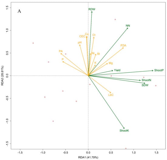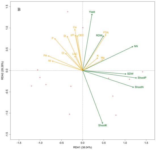 The general linear model procedure was used for the analysis of variance, and multiple comparisons between treatments were tested at the p < 0.05 level using the Duncan test. To characterize the relationship between various parameters, linear correlation analyses were applied, and Pearson’s correlation coefficients were determined at p < 0.05. These statistical analyses were performed with SPSS Statistics v22.0 (IBM Corp., Armonk, NY, USA). For further data exploration, a redundancy analysis (RDA) was used to clarify the dependent relationships between the explanatory variables (soil properties) and response variables (crop parameters) using the open source statistical language R v1.2.1335 (R Studio, Boston, MA, USA). The RDA used multiple linear regressions by allowing the regression of multiple response variables on multiple explanatory variables. Therefore, the RDA models a cause-effect relationship. The results of the RDA were shown on a triplot, on which the angles between the arrows of the response and explanatory variables denote correlations. The points for observations can be projected perpendicularly on the species lines and indicate the values [].