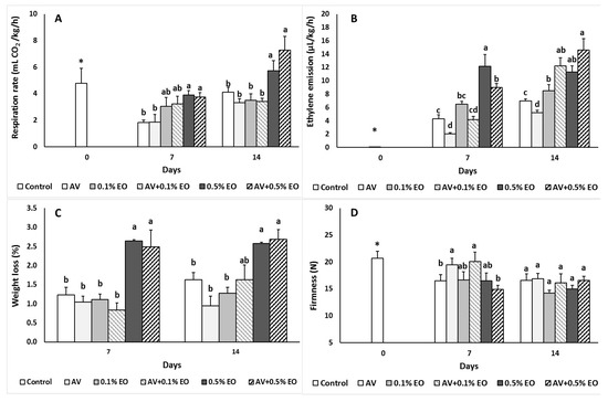 Impacts Aloe vera (AV at 10%) coating and/or sage essential oil (EO at 0.1% and 0.5%) on (A) respiration rate (mL CO2/kg/h), (B) ethylene emission (μL/kg/h), (C) weight loss (%) and (D) firmness (expressed in Newton) in tomato fruit following storage for 7 and 14 days. Fruit were maintained throughout at 11 °C and 90% RH. Values represent mean (± SE) of measurements made on eight independent fruit per treatment and storage period. On the columns, significant differences (p < 0.05) among treatments are indicated by different Latin letters for different days. Symbols of * or ns indicating significance or not, respectively, among controls through storage period.