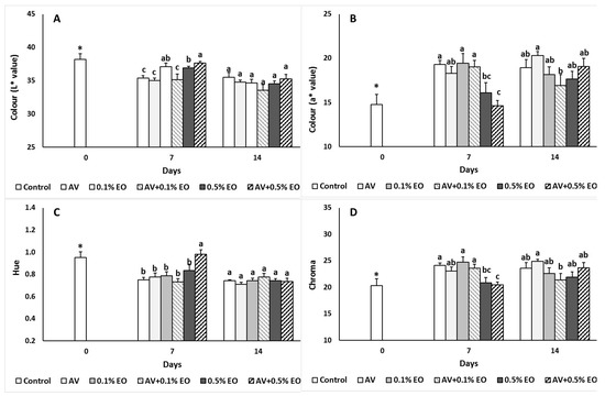 Impacts Aloe vera (AV at 10%) coating and/or sage essential oil (EO at 0.1% and 0.5%) on (A) L*, (B) a*, (C) hue and (D) chroma values in tomato fruit following storage for 7 and 14 days. Fruit were maintained throughout at 11 °C and 90% RH. Values represent mean (±SE) of measurements made on eight independent fruit per treatment and storage period. On the columns, significant differences (p < 0.05) among treatments are indicated by different Latin letters for different days. Symbols of * or ns indicating significance or not, respectively, among controls through storage period.