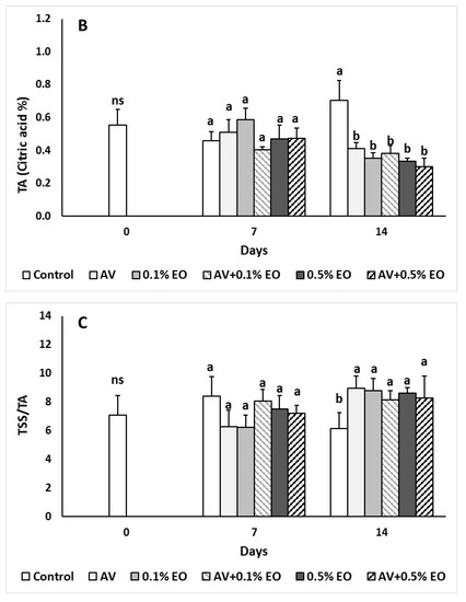 The TSS values ranged to similar levels at 7 days and significantly decreased (p < 0.05) in 0.5% EO-treated fruits after 14 days of storage compared to the control and AV treatments (Figure 3). The titratable acidity values of AV and/or EO treated fruits significantly decreased (p < 0.01) and the ripening index (TSS/TA ratio) was increased compared to the control (un-coated fruits) after 14 days of storage. This indicates that AV and/or EO treated fruits had increased sweetness compared to the control treatments. Acidity of raspberries subjected with A. vera gel did not differ with the untreated fruits after 8 days of storage [45] being in line with the current results for the 7 days of storage.