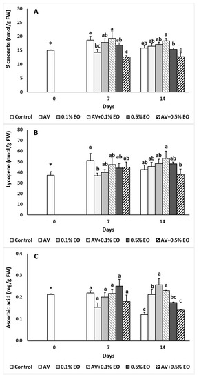 In tomato fruits the pigments content is changed during fruit development, while the chlorophyll content is reduced during maturation and carotenoids are produced promptly, thus synthesizing the red pigment lycopene and β-carotene. In the present study, in control fruits, β-carotene and lycopene content significantly changed the first 7 days of storage, while they remained to similar levels to the control following 14 d of storage (Figure 4A,B). Both β-carotene and lycopene content were decreased in 10% AV and in AV + 0.5% EO (only for β-carotene) coated fruits when compared with the control at 7 days of storage, while β-carotene content decreased in AV + 0.5% EO treatment after 14 days of storage (Figure 4A,B). When thyme and savory EO applied on peaches and nectarines, carotenoid content was maintained to similar levels with the control fruits [46].