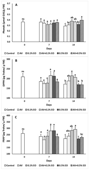 Impacts Aloe vera (AV at 10%) coating and/or sage essential oil (EO at 0.1% and 0.5%) on (A) total phenolics (μmol GAE/g FW) and antioxidant activity (mg Trolox/g FW) of (B) DPPH and (C) FRAP in tomato fruit following storage for 7 and 14 days. Fruit were maintained throughout at 11 °C and 90% RH. Values represent mean (±SE) of measurements made on eight independent fruit per treatment and storage period. On the columns, significant differences (p < 0.05) among treatments are indicated by different Latin letters for different days. Symbols of * or ns indicating significance or not, respectively, among controls through storage period.