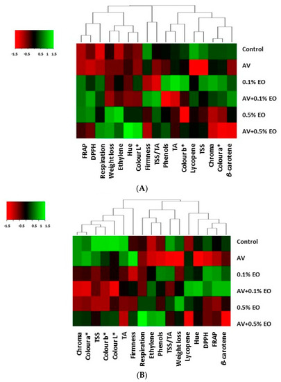 Quality changes in tomato fruit when subjected to Aloe vera (AV at 10%) coating and/or sage essential oil (EO at 0.1% and 0.5%). Heat map representing relative expression of postharvest performance elicited in tomato fruit following (A) 7 days and (B) 14 days of storage as compared to control fruits.