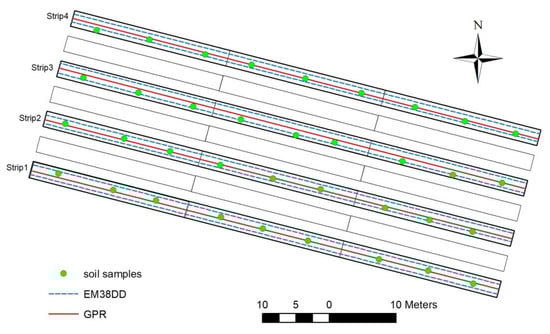 Immediately after the EMI survey, the GPR survey was carried out along 4 parallel longitudinal transects, about 8 m apart by sliding the sensor on the surface previously flattened (Figure 1). The GPR data were collected using a system with two central frequencies of 600 and 1600 MHz (IDS Ing-manufactured, RIS 2k-MF Multifrequency Array Radar-System, Italy), operating in mono-static (the transmitting and receiving antenna placed in the same box). The GPR (connected with DGPS) data were collected with trace increments of 0.024 m and time increments of 0.05 ns. The GPR produces a short pulse of high frequency (10–1000 MHz) electromagnetic energy, which is transmitted into the ground. The propagation of the radar signal depends on the electrical properties of the soil and it is primarily controlled by the water content [25]. Variations in the electrical properties of soils are usually associated with changes in volumetric water content which gives rise to radar reflections [16].