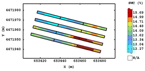The small SWC range of spatial variation could be attributed to the limited extension of the tested area as well as to the small heterogeneity of soil texture [39]. The highest values of SWC corresponded to the lowest parts of the field. This result was obtained despite there being no topographic variations in the study area, with no remarkable differences in height between the two areas (of about 0.6 m of the maximum difference). It was clear that the soil hydraulic arrangement did not eliminate completely the risk of water stagnation.