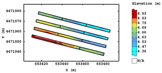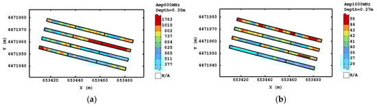 The map of the estimated amplitude for 600 MHz antenna at 0.30 m depth (Figure 9a) showed the same division of the field with a tendency towards low amplitude signals in the eastern part of the field, except the third strip, probably due to the variations in soil depth. In the third strip, the area with higher values of amplitudes corresponded to higher values of ECa in both polarizations.